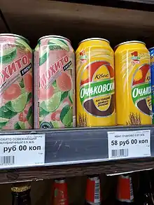 Cans of Ochakovsky kvas and Mokhito alcohol free cocktails at a store in Moscow region.