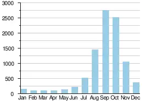 At the Markala dam, in an average year, the discharge of the Niger River reaches a peak of around 2,800 m3 (99,000 cu ft) in the second half of September but drops to under 120 m3 (4,200 cu ft) in the dry season between February and April. The average discharge is around 800 m3 (28,000 cu ft), but there are large year-to-year variations in the intensity of the monsoon and thus in the water flowing in the river.[1] In a dry year such as 1989, the average discharge was only 539 m3 (19,000 cu ft), while in a wet year such as 1995 the discharge was 1,229 m3 (43,400 cu ft).[6]