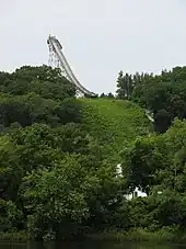 - Moving the tower was repeated a third time in 1955 when the tower was moved to Eau Claire, Wisconsin and erected at Hendrickson Hill along the Chippewa River in what is now the University of Wisconsin–Eau Claire Campus.[13] In 1968-69 Hendrickson Hill the hill was abandoned and the steel tower was once again dismantled and reassembled in its new location at Silver Mine Hill, 4.5 miles (7.2 km) downstream on the Chippewa River. The ski jump is still used at this site.[14]