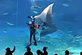 Whale sharks and manta rays are kept alongside many other fish species in the main tank.[3] Since 2015, the aquarium has also had a reef manta ray with a black body.[16] Since 2018 they also keep giant oceanic manta ray.[17] The world's first birth of a manta ray in captivity was at the aquarium in 2007. This species and the giant oceanic manta ray were only recognized as separate species in 2009; they were both classified as Manta birostris until then.[18][19][20] By the time the mother died in 2013, seven puppies were born and four survived.[21][22][23][24] There is a record that the male reef manta ray, which lived in captivity in 1992, lived for about 23 years.[25]