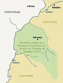 In green: territory ceded by Portugal to Spain in the terms of the Badajoz Treaty (1801)