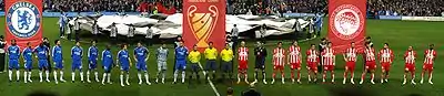 Chelsea and Olympiacos players arrayed in Stamford Bridge, in the second match for the 2007–08 UEFA Champions League first knockout round.