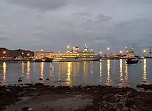 The Fulk al Salamah, the Sultan's secondary yacht, moored at the docks at Mina Qaboos, Muttrah