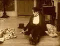 He retrieves himself, and walks surprisingly steadily for a few steps, until another mat approaches him, and his legs slide out from below him, causing him to fall on his back. He lands between a tiger rug and a stuffed Eurasian lynx, which terrify him as he thinks they are real. He tries edging away from each other, only resulting in more hilarity as Charlie tries kicking the tiger rug away and then later thinks his foot is being eaten by the tiger. However, it doesn't end there. He tries to lure the lynx by giving it an air-kiss, and then walks up to it and kicks it away. That, however, ends when he proceeds onto the table.