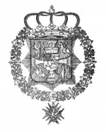 The star of the order consisted of an eight-pointed gold star with straight rays; the central golden disc bore a red-bordered white enamelled cross pattée with a golden rosette at its center and golden rays between the arms, surrounded by a blue enamel ring bearing the motto "Pro Fide, Lege et Rege" (For Faith, Law and the King).[5]