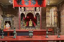 The oldest of the brick temples was completed in 1863 and is named Liet Sheng Kong which translated means "Temple of Many Gods and Goddesses".[3] In this temple visitors were allowed to worship any deity that they wishes to. The interior ceiling and walls of this building are covered with hanging boards with carvings or script to honored or thanking the Chinese deities for answering prayers. The room houses three altars. One teak altar at the front of the temple, brought to the temple from China, shows an elaborately carved courtyard scene, The second altar is used for supporting incense burners and the third (also from China) sits at the back wall of the temple. This altar support three carved, wooden statues representing Chinese deities. On the top sides of this altar there are 2 papier-mâché Southern lion heads employed by the Chinese to ward away evil spirits. These heads were also employed during Chinese festival parades in the area. Just inside of the temple there is a gong and just outside the temple's entry point there is a very large ceremonial urn which also originated from China.