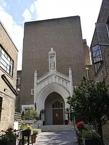 The original parish church of Our Lady of Victories was designed by noted architect George Goldie.[2] His grandson Joseph Goldie would later design the entrance screen.[3] The church opened on 2 July 1869, the Feast of the Visitation, taking over the congregation of St. Mary's Roman Catholic Chapel, Holland Street.[4] It became the pro-cathedral of the Archdiocese of Westminster as Cardinal Manning wished for a site more central than St. Mary Moorfields.[2] Our Lady of Victories served as the pro-cathedral until Westminster Cathedral opened in 1903.[5]