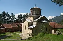 - "Dormition of the Holy Mother of God" (Uspenje), the main monastery in the group, is on the north slopes of the Kablar mountain. It is dedicated to the Holy Mother of God. Originally it was the site of the Jovanjska tower with a powerful bells ("Kulina bell tower") which could be heard in the town of Čačak, 16 kilometers away.[1] A new monastery was built in the 1939[7] on the ruins of the old tower, as a replica of the "Church of the Saint Constantine the Great and Saint Helena" in Ohrid. It is a female monastery, renovated in 2001.