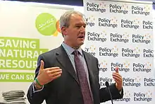 Despite his voting record "moderately for" laws to stop climate change,[24] he is a climate change sceptic,[23] and did not accept scientist David MacKay's offer of a briefing on climate change science.[25] Prior to being appointed at DEFRA, he described wind turbines as "ridiculous" and "useless" and called for the end of "Soviet" subsidies that supported their development. As an alternative to wind power, he supported the use of fracking.[1] At the 2013 Conservative party conference, he argued that there were advantages to climate change such as fewer deaths caused by cold weather and the ability to grow food further North.[26][27] During his time in office, Paterson cut funding for climate change adaptation by approximately 40%. In 2014, the outgoing Environment Agency chair Chris Smith said that flood defence budget cuts had left the agency underfunded and hampered its ability to prevent and respond to flooding in the UK.[28][29][30] When asked in a 2013 BBC interview about the alleged failure of a badger cull he had been responsible for, Paterson replied that "the badgers have moved the goalposts."[31]