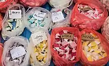 The candy is sold at the capital's cemeteries on November 1, All Saints' Day. In 2008, it was entered on the list of traditional products in the Masovian Voivodeship.[4] A comparable candy, known as trupi miodek (corpse honey), is sold in and around Kraków.[5] The confectionery is usually made as a cottage industry product, and some Varsovians shun it as possibly cooked in unhygienic conditions.[6]