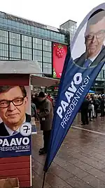 Väyrynen had been polling third or second in opinion polls for the election after Sauli Niinistö. He was also accusing other candidates of hiding their positive attitude of possible Finnish membership in NATO. He has also suggested that Finland ought to readopt the Finnish markka alongside the euro.[14] Väyrynen was eliminated from the second round of the election (5 February), placing third on the first round (22 January) behind the Green League's Pekka Haavisto by a close margin of 1.3% (37,000 votes).[15]