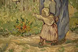 Theo had sent the photograph of Millet's First Steps with perfect timing. Theo's wife, Jo, was pregnant with their child, so it had special meaning to the family. In addition Van Gogh was still saddened by recent seizure episodes that impacted his mental clarity. Rather than vibrant colors, here he used softer shades of yellow, green and blue. The picture depicts the father, having put down his tools, holding his arms outstretched for his child's first steps. The mother protectively guides the child's movement.[36]
