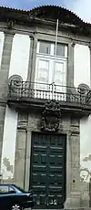 The three-storey, L-shaped building with its largest facade oriented to the south, and a small wing, towards the west, covered in tiled roof. The southern facade is symmetric and broken on the ground floor by seven sections, aligned on the first and second floors.[1] On the top floor, are seven windows, of which six are surmounted by broken frontispieces, while the central is much higher and flanked by curvilinear scribes.[1] The ground floor has three doors, with the central doorway surmounted by a granite coat-of-arms.[1] The narrow facade of the smaller corp, is oriented to the square, with the top and ground floors, towards the principal facade.[1]