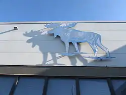 Photo of the iconic blue moose outside the entrance to Palmer High School | |