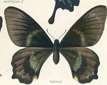 - ↑ Böhm, M.; Müller, C.J. (2018). "Papilio toboroi". IUCN Red List of Threatened Species. 2018: e.T16007A202206830. doi:10.2305/IUCN.UK.2018-2.RLTS.T16007A202206830.en. Retrieved 14 November 2021.