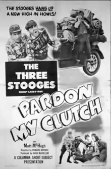 Pardon My Clutch is a 1948 short subject directed by Edward Bernds starring American slapstick comedy team The Three Stooges (Moe Howard, Larry Fine and Shemp Howard). It is the 105th entry in the series released by Columbia Pictures starring the comedians, who released 190 shorts for the studio between 1934 and 1959.