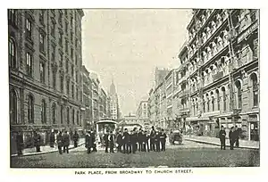 The Park Place station was a station on the demolished IRT Sixth Avenue Line in Manhattan, New York City. It had 2 tracks and two side platforms. It was served by trains from the IRT Sixth Avenue Line and opened on June 5, 1878. It closed on December 4, 1938. The next southbound stop was Cortlandt Street for local trains, and Battery Place for express trains. The next northbound stop was Chambers Street for all trains. The Chambers Street – World Trade Center / Park Place station complex can be found within the vicinity of the former elevated railroad station.