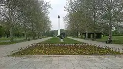 The Avenue of Peace with the memorial obelisk "Eternal Flame" [6] is located in the central part of the park. The park features a flower statue of the sculptor Lidija Mišić. Peace Avenue with 26 plane trees that were planted by statesmen, during a conference of the NAM in Belgrade until 1989, is 180 m long, which also represents the number of countries which had a commitment to peace as their political priority, through the so-called policy of peaceful, active coexistence. All participants of the First Conference planted the same plant – plane tree. The selection of plane trees is their longevity, which emphasizes the idea of establishing a lasting peace in the world. Next to each planted tree is a tablet with the name of the statesman and the country of origin, year of planting, and the denomination of the tree Platanus acerofilia. Plane tree seedlings are placed at a distance of eight meters so that they could merge at a certain height of their growth and thus form a unique green series which also symbolizes of the connection of all nations through a common idea. From the competition solution to today, only 9.5 hectares of park area have been realized. Although little has been done out of the original idea of the architect Pališaški, [7] specificity in the formation of a modern park is basically considered even today.[8]