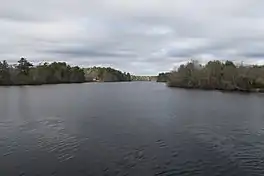 Parker Mills Pond is a 105-acre (0.42 km2) pond in Wareham, Massachusetts. The Wankinco River flows through the pond. Additionally, Harlow Brook flows into the pond. The water quality is impaired due to non-native aquatic plants and non-native fish. Route 25 runs through the northern part of the pond just east of the highway's terminus with Interstates 195 and 495, and Route 28 runs along the southern shore of the pond.[1]