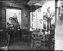 The cyclorama, under the genius of this man, came out a masterpiece. The only concession Paul asked, to which Walter Knott readily agreed, was the exclusive right to manufacture and sell art souvenirs, booklets and paintings on the premise.[12] Von Klieben lived on the farm and had his studio "at the end of the Ghost Town Trail," in "the adobe building which adjoins Ghost Town" that was completed shortly before February 1942 and was constructed of adobe bricks made on the property. This building is likely that which is now used as the entrance to Spurs restaurant.[13][14]