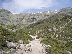 Hiking is one of the most practiced sports thanks to the fact that there are a series of paths and trails that run through the cirque. The busiest and most visited of them is the one that leaves the Puerto de Cotos and leads to the Laguna Grande de Peñalara, passing very close to the Laguna Chica. This path has a very low level of difficulty, is signposted and is done in an hour and a quarter,[5] which makes the influx of people is abundant throughout the year. This is one of the reasons why there are areas of the cirque that enjoy a maximum level of environmental protection within the Peñalara Natural Park. From this road, as it passes through the northeast end of the cirque, there is a path that ascends northwest along the northern moraine and leads to the Laguna de los Pájaros. From the main road there is another trail that heads south and leads to the Laguna Chica of Peñalara and, later, to the first section of the ascent path to the peak of Peñalara, which is located on the southern edge of the glacier cirque. There is a third trail, less marked than the previous ones, which directly connects the ascent path to the peak of Peñalara with the Laguna Grande de Peñalara, passing through the Zabala Refuge. The description of a complete circular route to Peñalara and the GPS track can be found on Wikiloc, which also includes references to numerous information, photos and a video that will help the hiker.