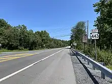 In the 1930s, PA 443 was realigned at Green Point to head west to US 11/US 15/US 22/US 322 (North Front Street) on the east bank of the Susquehanna River north of Rockville along a paved road. The former alignment of the route between Jonestown and Green Point became a northern extension of PA 72. PA 925 was extended west from New Ringgold to US 122 (now PA 61) west of Orwigsburg in the 1930s; the route replaced the section of US 122 (which had replaced US 120) on West Market Street in Orwigsburg that was realigned to bypass the borough to the southwest. At this time, the entire length of PA 925 was paved. In addition, the highway between PA 29 south of South Tamaqua and Lehighton was constructed as an unnumbered paved road in the 1930s.[10] In the 1940s, PA 443 was extended east from US 122 in Schuylkill Haven to US 209/US 309 in Lehighton along its current alignment. The route replaced the entire length of PA 925 between Orwigsburg and South Tamaqua. In addition, the route was widened to a multilane road between the border of Dauphin and Lebanon counties and Fort Indiantown Gap.[11] In 1977, US 22/US 322 were shifted from North Front Street to a freeway a short distance to the east; the western terminus of PA 443 remained at unnumbered North Front Street a short distance to the west of an interchange with the US 22/US 322 freeway. The route was widened into a divided highway in the vicinity of the interchange.[12][13]