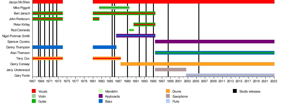 In 1967, the Scottish entrepreneur Bruce Dunnet, who had recently organised a tour for Jansch, set up a Sunday night club for Jansch and Renbourn at the now defunct Horseshoe Hotel in Tottenham Court Road. London.[5] McShee began joining them as a vocalist, and by March of that year, Thompson and Cox were being billed as part of the band. Renbourn claims to have been the catalyst that brought the band together, although he credits Jansch with the idea of getting the band to play in a regular place, "to knock it into shape".[6]