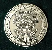 The Persian Gulf Veterans National Medal is an honorific military medal authorized by United States Congress presented to members of the U.S. Armed Forces who served in a combat zone during the Persian Gulf War.[1][2][3]