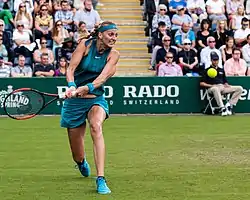During the grass-court swing, Kvitová competed in Eastbourne where she advanced to the quarterfinals but was then forced to withdraw due to a hamstring injury.[93] Kvitová was seeded sixth at Wimbledon. She won her first two matches easily against compatriot Andrea Hlaváčková and German Mona Barthel. She faced former champion and 30th seed Venus Williams in the third round and was two points away from losing the match but went on to win in three sets. After dismissing Peng Shuai in the fourth round, she beat two more Czechs in the form of Barbora Záhlavová-Strýcová and Šafářová to reach the final. There, she defeated Eugenie Bouchard in straight sets to win her second Grand Slam title.[94][95] She rose to world No. 4 as a result, thus returning to the top 5 rankings for the first time since 2012.[11]