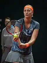 In Indian Wells, Kvitová lost in the third round to Christina McHale in three sets.[46] In Miami, she exited in the second round after falling to Venus Williams in three sets.[47] The following month in Stuttgart, she defeated Schiavone and Angelique Kerber to reach the semifinals, where she lost to Sharapova in straight sets, thus snapping a long run of 27 consecutive wins indoors.[48] At the Madrid Open, she was the defending champion, but lost in the second round to compatriot Lucie Hradecká.[49] The following week in Rome, she beat Anastasia Pavlyuchenkova and Sorana Cîrstea to record her first quarterfinal appearance there, where she lost to Kerber.[50] Kvitová was seeded fourth at the French Open. She advanced to the semifinals for the first time in her career, after defeating Ashleigh Barty, Urszula Radwańska, Nina Bratchikova, Varvara Lepchenko, and Yaroslava Shvedova.[51] There, for the third time this year, she lost to Sharapova, this time allowing the Russian to reclaim the No. 1 ranking.[52]