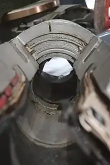 The experiments led to a particularly promising arrangement - a 40-gallon steel drum[lower-alpha 7] buried in an earthen bank with just the round front end exposed. At the back of the drum was an explosive which, when triggered, ruptured the drum and shot a jet of flame about 10 ft (3.0 m) wide and 30 yd (27 m) long.[37] The design was reminiscent of a weapon dating from late medieval times called a fougasse - a hollow in which was placed a barrel of gunpowder covered by rocks, the explosives to be detonated by a fuse at an opportune moment. Livens' new weapon was duly dubbed the flame fougasse.[36] The flame fougasse was demonstrated to Clement Attlee (Lord Privy Seal), Maurice Hankey, and General Liardet (GOC 56th Division) on 20 July 1940.[36][38]