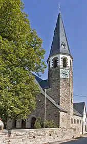 • Evangelical church, Brühlstraße 1 – two-naved galleried hall church with Romanesque elements, sandstone-block building, 1907/1908