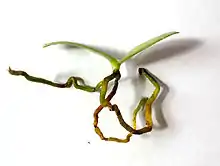 - A very short monopodial stem with 5-6 large silvery-green pendent leaves that can measure over 60 cm in length