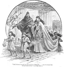 Pharaoh's daughter is a main figure in a three-act oratorio called Solomon written by the composer George Frideric Handel. It was composed "between May 5th and June 13th 1748 and it was first performed at Covent Garden on March 17th 1749".[27] The first act deals with the dedication of the temple and Solomon's marriage to Pharaoh's daughter. The second act is about the story of his judgement between the two women both claiming the same baby. The third act is about the visit of the Queen of Sheba, "who is dazzled by his wisdom and the splendour of his court."[27]