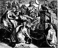 The Jewish Encyclopedia lists a collection of other stories about Solomon and Pharaoh's daughter, saying she "brought Solomon 1,000 different kinds of musical instruments, explaining to him that each of them was used in the worship of a special idol. She hung over his bed a canopy embroidered with gems which shone like stars; so that every time he intended to rise, he, on looking at the gems, thought it was still night. He continued to sleep, with the keys of the Temple under his pillow; and the priests therefore were unable to offer the morning sacrifice. They informed his mother, Bath-sheba, who roused the king when four hours of the day had flown. She then reprimanded him for his conduct; and the verses of Proverbs 31:1–9 are considered by the Rabbis as having been pronounced by Bathsheba on that occasion."[9]