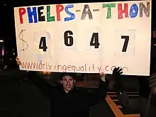 Phelps-A-Thon.com assists groups that are being picketed by WBC in setting up a Telethon type of counter-protest. Through the "Phelps-A-Thon.com" website, supporters can pledge online to donate a certain amount of money for every minute of WBC pickets against a specific target, usually LGBT or Jewish groups.[8] The longer they protest, the more money they raise for the cause that they are demonstrating against.[9][10][11]