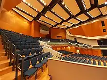Beissel was assisted by Oliver Pohl[5] and Marc Piollet from 1993 to 1997 as first bandmasters.[19] The symphony concerts of the Philharmonic State Orchestra were initially held in the Steintor-Varieté until the restoration was finished.[20] Furthermore, the opera house and the Ulrichskirche concert hall were used.[20] From 1995 to 1998, the hall of the Congress and Cultural Centre served as a temporary venue.[20] In 1998, Beissel inaugurated the Great Hall of the Georg-Friedrich-Händel-Halle in the Nördliche Innenstadt, the orchestra's first permanent venue.[21] In addition, concert series were held in the auditorium of the Martin Luther University of Halle-Wittenberg ("Viennese Classical Music"), at the Neues Theater ("Baroque Music") and at the Galerie Moritzburg (New Music with the Ensemble Konfrontation).[22] Furthermore, there was a popular symphonic series with "Bella Musica".[22] For special and choral concerts, the Halle Cathedral and the St. Moritz, Halle were available.[22] Last but not least, the Handel House was used for chamber music and the Freylinghausen-Saal for baroque matinées, as well as the Domplatz and the courtyard of the Handel House for open-air concerts.[22] During Beissel's tenure as General Music Director, the orchestra gave guest performances in Argentina, Spain and Austria, among others.[5]