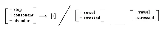 Taken together and read from left to right, this notation of the rule for intervocalic alveolar flapping states that any alveolar stop consonant (/t/ or /d/) becomes a tap ([ɾ]) in the environment where it is preceded by a stressed vowel and followed by an unstressed one.