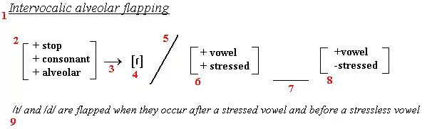 The rule given above for intervocalic alveolar flapping describes what sound is changed, what the sound changes to, and where the change happens (in other words, what the environment is that triggers the change). The illustration below presents the same rule, with each of its parts labelled and described.