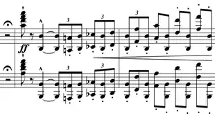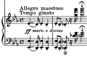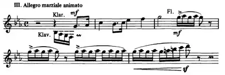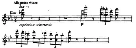 The orchestra introduces the main theme of the piece with a powerful motif.[3] A story exists that, to mock his critics, Liszt and his son-in-law, Hans von Bülow, put the words Das versteht ihr alle nicht, haha! (none of you understand this, ha-ha) to the notes of the opening two bars.[4] The piano then comes in with an octave passage, spanning four octaves. A duet ensues between the piano and the clarinet in a quiet and peaceful passage, which is soon taken over again by the main theme. Following this, the piano plays fast, downward chromatic octaves, before recapitulating a section from earlier in the movement, this time in G major. The movement finishes with the main theme played by the strings while the piano imitates a harp with fast, quiet arpeggios, culminating with an upwards chromatic scale in sixths, diminishing to ppp volume.