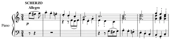 The third movement, a scherzo, is written in minuet and trio form. It opens with a joke-like statement, and the composer uses some polyphony. The trio is in the relative minor key of C major (A minor) and contains running arpeggios in the right hand with the left hand playing a melodic line in octave form. The coda of this short movement ends the Scherzo softly with a tritone substitute authentic cadence.