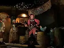 Once guests are out of the tunnel, cannonballs whistle overhead and explosions throw water into the air – a fierce battle in the Caribbean between a marauding pirate galleon, the Wicked Wench, and a Spanish fortress is in full swing. From the deck of the Wicked Wench, the Pirate Captain (modeled on Blackbeard's appearance) leads the assault as colonial defenders can be seen manning the fort's cannons, barking orders to each other in Spanish and shouting threats at the invading pirates. The village of Puerto Dorado on Isla Tesoro is overrun with pirates in search of treasure. The first sight is the town square, where some pirates have kidnapped the mayor, Carlos, and threaten to drown him in a well if he does not divulge the location of the treasure. Carlos' wife peeks out of an upstairs window, telling him to be brave and not talk; she is shot at as Carlos is repeatedly dunked in the water while a line of other captive city officials look on. An auction scene follows, where an auctioneer pirate tries to sell off the local women with the banner, "Take a Wench for a Bride!" The bidders yell out for the "redhead", a flirtatious woman in a red dress. In the next scene, women are being chased through town by pirates. The "Pooped Pirate" reminisces about the "lively lassie" he wished to "hoist his colors" upon. Holding her slip as he prattles on, the woman peers out from inside a barrel that sat right behind the pirate's back as he keeps boasting, unaware.[12]