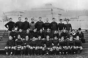 In 1914, Pitt hired Pop Warner as Pitt's head coach. His arrival at Pitt gave the program instant national credibility, lifting the perception of the program from a regional power to that of a national one.[17] Warner's impact was immediate. Led by center Robert Peck, Pitt's first First Team All-American, and All-American end James Pat Herron, Warner's first Pitt team in 1915 went 8–0, shutting out five opponents, and was trumpeted by football historian Parke H. Davis as that season's national champion.[18] His second season duplicated that success, repeating an 8–0 record while collectively outscoring opponents 255–25, and garnering what is widely regarded as a consensus national championship.[19] The 1916 team was led again by Herron and Peck, now in his last season, as well as All-Americans fullback Andy Hastings and guard "Tiny" Thornhill. Also on that team were Jock Sutherland and H.C. "Doc" Carlson, who both would garner First Team All-American selections while members of the undefeated 1917 team, and go on to become perhaps Pitt's most legendary coaches in football and basketball, respectively. The 1917 team, nicknamed "The Fighting Dentists" because over half the roster became doctors or dentists, finished 10–0 with five shutouts despite losing several players to military service at the outbreak of World War I. The Spanish flu pandemic of 1918, saw the implementation of quarantines that eliminated much of that year's college football season. All of Pitt's games that year were played in November, including a high-profile game played as a War Charities benefit against undefeated, unscored upon, and defending national champion Georgia Tech, coached by the legendary John Heisman. Pitt swept through its first two games and then dismantled Georgia Tech 32–0 in front of many of the nation's top sports writers including Walter Camp. The 1918 Panthers were named by multiple selectors as a national champion for that season.[20]