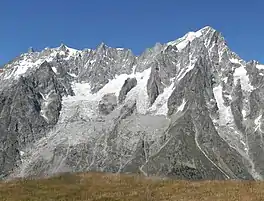 The Planpincieux Glacier (French: Glacier de Planpincieux, Italian: Ghiacciaio di Planpincieux) is a hanging glacier, located on the southern slopes of the Grandes Jorasses in the Mont Blanc massif of the Alps. It is located above the hamlet of Planpincieux, Val Ferret, in the Aosta Valley. The glacier has a length of 2 km (1.2 mi) and covers an area of 1.008 km2 (0.389 sq mi), and its elevation ranges from 2640 to 3680 m at a slope of 30°.[1] Thermally, it is a temperate glacier.[3]