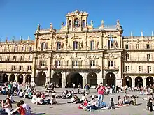 The Plaza Mayor (English Main Plaza) in Salamanca, Spain is a large plaza located in the center of Salamanca, used as a public square.[1] It was built in the traditional Spanish baroque style and is a popular gathering area.[2] It is lined by restaurants, ice cream parlors, tourist shops, jewelry stores and a pharmacy along its perimeter except in front of the city hall. It is considered the heart of Salamanca and is widely regarded as one of the most beautiful plazas in Spain.[2][3][4] It is connected to the shopping area Calle del Toro from the northeast, Calle de Zamora from the north, the restaurants on Calle de Concejo from the northwest, Calle del Prior and the small Calle de la Caja de Ahorros from the west as well as Plaza del Corrillo from the south.