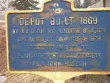 A historic marker for the NY & OM Railroad Auburn Branch depot, built in 1869 and operated by the O&W Railroad.