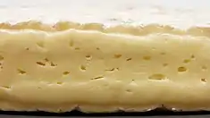 Pont-l'Évêque is an uncooked, unpressed cow's-milk cheese, square in shape usually at around 10 cm (3.9 in) square and around 3 cm (1.2 in) high, weighing 400 grams (14 oz). The central pâte is soft, creamy pale yellow in color with a smooth, fine texture and has a pungent aroma. This is surrounded by a washed rind that is white with a gentle orange-brown coloration. The whole is soft when pressed but lacks elasticity. It is generally ranked alongside Brie, Camembert, and Roquefort as one of the most popular cheeses in France.