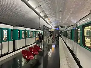 ![]() MF 67 rolling stock at Porte d'Auteuil. Left track is for regular traffic (toward Boulogne – Pont de Saint-Cloud), central track is a connection with Line 9 to Porte de Saint-Cloud via Ateliers d'Auteuil or Porte Molitor ; it's also used for direction to Gare d'Austerlitz via Michel-Ange – Molitor ; first train and during rush hours, trains will ride the turn-around track (nicknamed: Boucle d'Auteuil), third track is unused. | |||||||||||