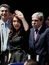 After the electoral victory of 2011, the ruling party regained control over both chambers of Congress.[94] They initiated a period of fiscal reform, which included several tax increases, limits to wage increases, but increases in protectionism and reorganization of state-owned enterprises.[95] Congress passed an anti-terrorism law, criticized for its vague and imprecise terms, that may allow it to be used against political opponents of the government.[96] Hugo Moyano, main union leader, who was a strong supporter of kirchnerism, began to oppose the President.[97] Moyano would later organize a big protest at Plaza de Mayo, with 30,000 people, requesting the abolition of capital gains tax.[98] However, her close union ally Enrique Omar Suárez, another powerful union leader, has remained in support of her.[99] The Vice President Amado Boudou got involved in a political scandal, suspected of favoring the Ciccone currency printing business.[100] The poor maintenance of rail services led to a rail disaster that left 51 dead and 703 injured.[101] The government has also begun to devote more attention to the Falkland Islands sovereignty dispute (prompted by the 30th anniversary of the Falklands War).[102] Fernández also supported the nationalization of YPF.[103]