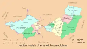 Prestwich-cum-Oldham (also known as Prestwich with Oldham)[1][2] was an ancient ecclesiastical parish of the hundred of Salford, within the historic county boundaries of Lancashire, England. With the Parish Church of St Mary the Virgin, Prestwich as its centre, this parish encompassed a total of ten townships,[2] and within them, several smaller chapelries.